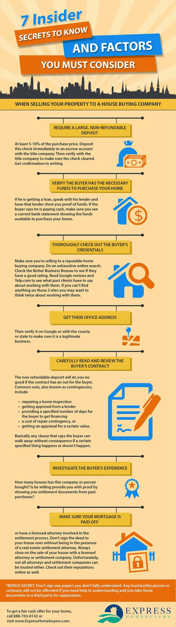 How do you avoid these nightmare situations? Just like in any industry, there are good guys and there are not-so-good guys. Armed with the right information, you’ll be able to tell them apart and make the best decision. Here are the 7 insider secrets to know and factors you must consider when you’re selling your property to a house buying company. If you take the time to follow these steps, it’s highly unlikely you’ll become a victim of any “we buy houses” scams.